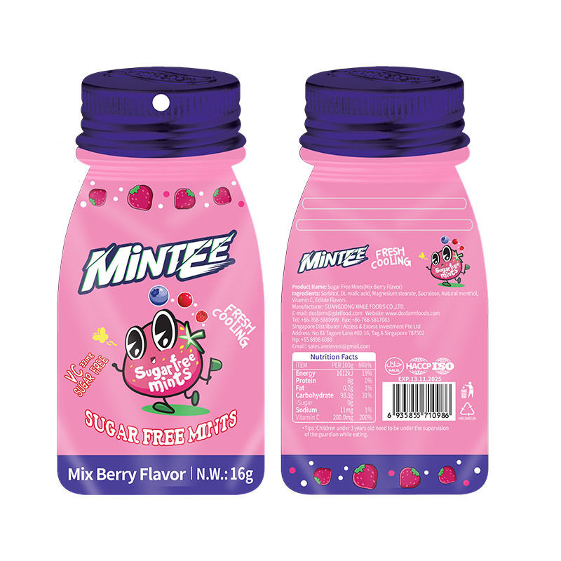 | Verkooppunten | geen suiker, vitamine C, frisse adem, koelend, zure en zoete smaak, patent fles ontwerp |